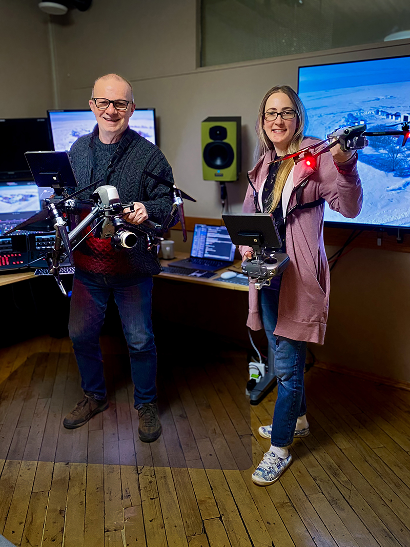 Certified advanced RPAS pilot "Java Jack" Tunnicliffe and camera assistant/gimbal operator Kristine Dowler pose with the DJI drones used for aerial photography on the film. And because we don't want to give away any spoilers, the winter scene on the monitors behind them is an image of a friend's local farm (not in the movie).